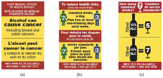 - Austen, I.; Yukon Government Gives in to Liquor Industry on Warning Label Experiment. New York Times. 6 January 2018. Available online: https://www.nytimes.com/2018/01/06/world/canada/yukon-liquor-alcohol-warnings.html (accessed on 11 October 2019).
