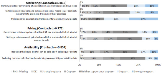Support for alcohol policies was measured using seven items previously used in research conducted in Australia and the UK [35,36,37]. These items were first introduced in the wave 2 survey, with no wave 1 data available. To assess support for alcohol policies, participants were asked, “To reduce the problems associated with excessive alcohol use, to what extent would you support or oppose each of the following policies…?”, followed by a list of seven policy options targeting alcohol price, availability, and marketing (Figure 2). These policy options were adapted from the study by Buykx et al., [37] as well as a public opinion survey conducted by the Yukon government to inform the local liquor act in 2017 [63]. Responses were recorded on a five-point Likert scale (1 = Strongly oppose and 5 = Strongly support), and included ‘Don’t know’, ‘Prefer not say’ and ‘Missing’ as options.