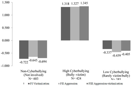 LCA was used, taking into account the scores of the three cyberbullying behaviors (victimization, aggression, and aggression-victimization). As seen in Table 2, the class obtaining the best fit for the BIC, AIC, and entropy indicators was that consisting of three profiles. The first profile, non-cyberbullying, consisted of a total of 603 students (42.70%) having very low scores on the subscales of victimization, aggression, and aggression-victimization, identified as “not involved”. The second profile, high cyberbullying, with 424 students (30.02%) having high levels of victimization, aggression, and aggression-victimization, identified as “bully–victims”. The third profile, low cyberbullying, consisting of 385 students (27.26%), had moderately low scores on the three analyzed subscales of cyberbullying, identified as “rarely victim and bully”. Figure 1 shows the LCA solution including the z scores for victimization, aggression, and aggression-victimization.