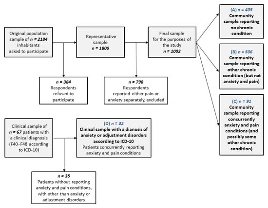 The data from the clinical sample were collected between January and June 2017 at the Sternberk Psychiatric Inpatient Hospital (9 patients) and the Kromeriz Psychiatric Inpatient Hospital (58 patients). In total, the randomly collected clinical sample consisted of 67 patients with a diagnosed disorder from the spectrum of anxiety, adjustment and somatoform disorders (F40‒F48) according to the International Classification of Diseases (ICD-10) criteria. For the purposes of our study analyses, 32 patients (mean age: 39.1 years, 18.8% male) with a diagnosis of anxiety disorders or adjustment disorders according to ICD-10 who concurrently reported anxiety and some pain condition described above were selected from the clinical sample. Figure 1 summarizes the final population and clinical sample selection.