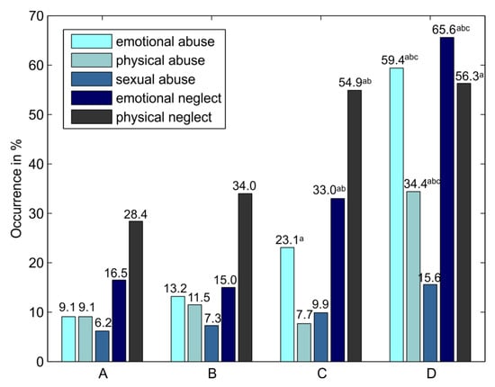 Prevalence of various childhood trauma types in the research groups. Note: Various types of childhood trauma as independent variables dichotomized according to Walker’s clinical cut-off scoring [48]. (A) Community sample reporting no chronic conditions (n = 405); (B) Community sample reporting other chronic conditions (n = 506); (C) Community sample reporting anxiety and pain (n = 91); (D) Clinical sample (respondents with a clinical diagnosis of anxiety or adjustment disorder who concurrently reported anxiety and some pain condition, n = 32). a p < 0.05 in comparison with group (A); b p < 0.05 in comparison with group (B); c p < 0.05 in comparison with group (C); Differences in occurrence of childhood trauma types between groups assessed by a test of proportions with Bonferroni correction.