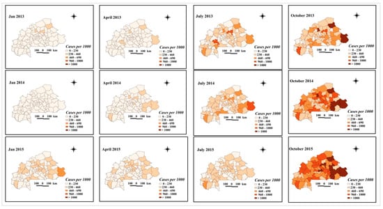 Spatio-temporal distribution: (a) number of consultations per district 2013–2015; (b) number of consultations per district 2016–2018; (c) number of cases tested per district 2013–2015; (d) number of cases tested per district 2016–2018; (e) number of confirmed cases per district 2013–2015; (f) number of confirmed cases per district 2016–2018.