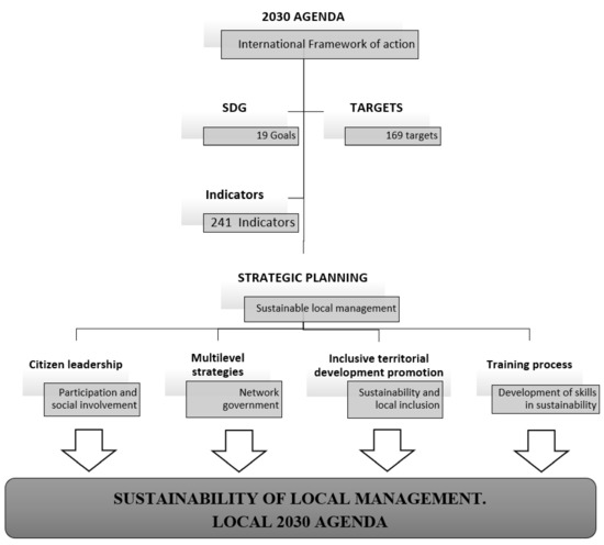 Traditionally, Agendas 21 for local development (L21A) have been a clear example of these small plots of social and environmental change demanded by society today, even in spite of the discrepancies, controversies, resistance, and frequent divorces that usually accompany any sphere of citizen intervention. Within the L21A processes, strategic and participatory planning acquires true meaning as a methodology of intervention and local transformation that has no reason for existence if it is not for citizen involvement and social leadership [34]. Currently, the 2030A and the Sustainable Development Goals (SDG) are the frameworks of reference guiding municipal administrative institutions, ensuring that their management model is sustainable and incorporates sustained strategic planning.