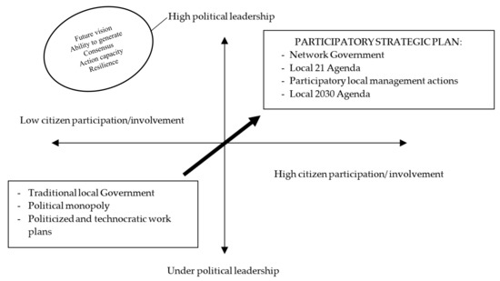Therefore, in our case, by taking strategic planning to the design and implementation of sustainable municipal management models built out of the principles of deliberative democracy, we would be talking about a networked or relational municipal government model based on participation and political leadership [43,44,45]. The following diagram (Figure 2) illustrates the different poles that can result from a combination of both aspects, marking as a favourable scenario for the elaboration of strategic plans in those cases in which there is high participation and marked political leadership [46].