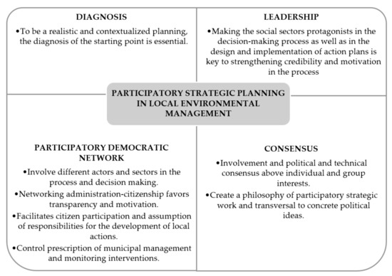 In general, and taking into account the four axes mentioned above, participatory strategic planning applied to the development of sustainable municipal management models is defined by four dimensions that govern its methodological process and its objectives, becoming an ideal method for the development of participatory processes at a municipal level (Figure 3).