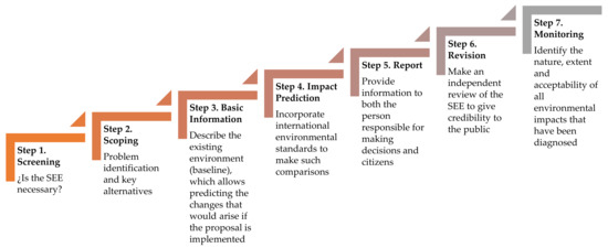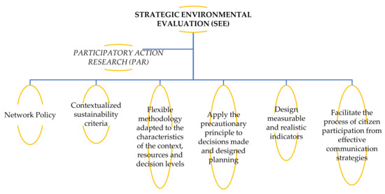 From the logic of the activities in strategic planning, the strategic environmental evaluation (SEE), inspired by the proposals of the PAR (participatory action research) [47], is one of the ‘most complete instruments for decision support on wide-ranging development initiatives with potential effects on the environment. The SEE has been defined as the formalized, systematic and global process for assessing the environmental impacts of a policy, plan or program, as well as its alternatives, including the preparation of a written report on the results of that evaluation and their use for the adoption of public decisions on which to account [48,49,50]. At the same time, it is considered to be a process to integrate the concept of sustainability from the highest levels at which decisions about development models are taken’ [51] (p. 27). Historically, at international level, the SEE appears in the first National Environmental Policy Act (NEPA) (EE.UU, 1969) that required reports on the environmental consequences of federal actions. In the European Union, the development of the SEE is framed in the European Council Guidelines (85/337/EEC). Its premise was to incorporate environmental assessments at all levels of ‘decision making’ [50,52].