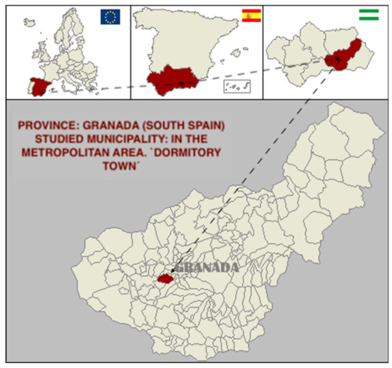The study was carried out in a municipality in the metropolitan area of the city of Granada (South Spain, Europe), located 7 km from the capital, considered to be a “dormitory town” (linked to work in the capital), with approximately 20,000 inhabitants, and whose main economic sources are agriculture and the service sector (Figure 7).