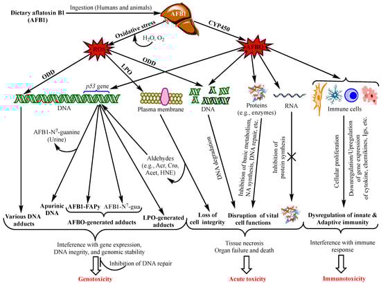 Aflatoxins exert various toxicological effects with different mechanisms, most of which are not yet fully elucidated. Intensive research has been carried out to investigate the mechanisms of the toxicity of aflatoxins to provide a scientific basis for the design of preventive and control means. Advanced knowledge in the field can also serve as a scientific tool for the provision of regulatory purposes by food safety authorities. The mutagenic effects of AFB1 have been the focus of most studies since the discovery of this aflatoxin and were ascribed mainly to the intermediate metabolite AFB1-exo-8,9 epoxide (AFBO) [13]. As a highly unstable molecule, AFBO reacts with cellular macromolecules, including nucleic acids, proteins, and phospholipids, to induce various genetic, metabolic, signalling, and cell structure disruptions [14,15,16]. However, increased evidence is being built up demonstrating equally dramatic or higher effects of AFB1 on cell function and integrity through the induction of oxidative stress (OS) [17,18,19]. Figure 1 summarizes the different toxicity mechanisms of AFB1 involving AFBO and OS to cause genotoxicity, immunotoxicity and acute intoxication by acting on genomic DNA, other functional macromolecules and immunocompetent cells.