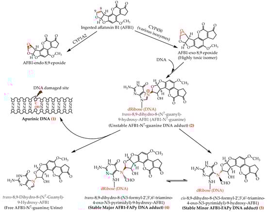 AFBO has long been considered as the ultimate metabolite responsible for the genotoxic effects of AFB1 as well as other aflatoxins bearing a double bond between carbons C8 and C9 done in the furan ring [6,21]. The mechanisms of toxicity mediated by this AFB1 reactive metabolite are the best understood and have been extensively reviewed [17,22,23,24]. Upon ingestion, AFB1 is absorbed in the duodenum and reaches the liver where it is bioactivated by the action of various microsomal cytochrome enzymes (CYP450). These are monooxygenases that catalyse the oxidation of the C8 = C9 double bond in the furan ring yielding AFB1-exo and -endo 8,9 epoxide stereoisomers, with the former isomer being >1000 times more reactive/toxic than the latter [25]. Different CYP450 isozymes are responsible for the bioactivation of AFB1 depending on the host, the organ, and the sub-cellular component. In humans, among 57 CYP450 identified isoenzymes, the microsomal CYP1A2, 3A4, 3A5, 3A7, 2A3, and 2B7, the hepatocytic 3A3, and the lung CYP2A13 are the principal isozymes responsible for AFB1 bioactivation in the respective organs [26,27]. In the liver, the bioactivation is essentially catalysed by CYP1A2 or 3A4, with predominating action under low or high exposure conditions, respectively; CYP1A2 predominates under the actual food contamination levels and is also responsible for the transformation of AFB1 into the less toxic endo-epoxide isomer [28,29]. In animals and insects, various CYP450 isozymes, including CYP1A1, 1A, 1A2, 2A5, 2A6, 3A, 3A4, 3A13, and 321A1, were reported to catalyse the bioactivation step, depending on the species and the organ where they are produced. The specific roles of CYP450 isozymes in AFB1 metabolism and their distribution in different hosts and organs were reviewed elsewhere [30].