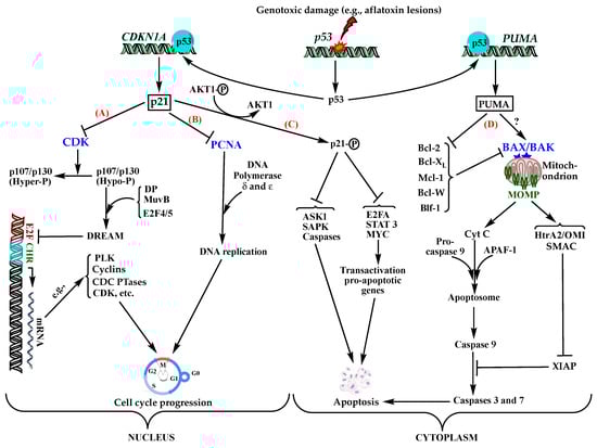 Main mechanisms used in normally functioning cells to induce cell cycle arrest or apoptosis as a response to DNA damage affecting p53 gene to inhibit cell cycle progression in the nucleus (A,B), or apoptosis in the cytoplasm (C,D). (A) p21, as a potent inhibitor of CDKs, inhibits the phosphorylation of p107 and p130 proteins, which in their hypo-phosphorylated states can bind to MuvB core complex, E2F4-5, and DP and form an active DREAM complex. Once formed, DREAM binds to E2F and CHR promoters and represses the transcription of many genes, e.g., polo-like kinases (PLK1), cyclins A, B1, and B2, CDK1, CDCs 20, 25A, and 25C, MCM5, BIRC5, etc., involved in the progress of the cell cycle at different stages and checkpoints, thereby arresting the cell cycle at any stage of the progression depending on the gene(s) inhibited [55]. In the absence of p21, CDKs remain active and hyper-phosphorylate p107 and p130 preventing them from binding to the other DREAM components, thereby leaving E2F and CHR promoter sites free to bind transcriptional activators that, on the contrary, promote the cell cycle progression [54,56]. (B) p21 interacts with PCNA in the nucleus and prevents it from binding to the δ subunit of DNA-polymerase, which blocks DNA replication as well as DNA repair, among other functions ensuring the fidelity of DNA duplication [57]. (C) p21 can be phosphorylated by the serine threonine kinase AKT1 and prevented from translocating into the nucleus; in the cytoplasm, it acts as an anti-apoptotic factor that inhibits pro-apoptotic enzymes, such as ASK, SAPK, and different caspases. It also inhibits transcriptional factors, such as E2F1, STAT3, and MYC preventing the transactivation of pro-apoptotic genes [54,58,59]. (D) p53 transactivates PUMA gene as the major p-53-dependent mechanism for intrinsic apoptosis induction. Under normal conditions and in the absence of stimuli, apoptosis is restricted by five pro-survival proteins of the Bcl-2 family; Bcl-2, Bcl-XL, Mcl-1, Bcl-W, and Blf-1. Upon exposure to genotoxic stimuli, such as aflatoxins, p53 upregulates the expression of PUMA, a member of the Bcl-2 homology 3 (BH3)-only family, which inhibits all of the five pro-survival Bcl-2 proteins, thereby de-repressing the pro-apoptotic proteins BAX and/or BAK. This initiates mitochondrial damage allowing leakage of pro-apoptotic proteins through MOMP formation upon oligomerization of BAX/BAK, namely cytochrome C, HtrA2/OMI, and SMAC, which cooperatively induce apoptosis; cytochrome C binds APAF-1 and procaspase 9 to form an apoptosome and activate caspase 9 triggering the caspase cascade directly involved in apoptosis. Yet, caspase cascade can still be blocked by the pro-survival protein XIAP inhibitory to caspases 9 and 3. To proceed with apoptosis, SMAC and HtrA2/OMI combine to inhibit XIAP and relieve the caspases [60]?: In the absence or saturation of pro-survival Bcl-2 proteins, PUMA can directly activate BAX/BAK to resume the apoptosis process starting from MOMP formation, but this needs further studies to be ascertained [61]. Abbreviations: Bcl-2: B cell lymphoma-2; BH3-only: Bcl-2 homologue 3-only; Bcl-XL: B cell lymphoma extra-large; MuvB: Multivulval class B; DP: Dimerization partner; DREAM: Dimerization partner, RB-like, E2F and multivulval class B; CHR: Cell cycle gene homology region; PLK: Polo-like kinase; CDK: Cyclin dependent kinase; CDC: Cell division cycle; MCM: Minichromosome maintenance; BIRC: Baculoviral inhibitor of apoptosis repeat-containing 5; PCNA: Proliferating cell nuclear antigen; ASK: Apoptosis signal-regulating kinase; SAPK: Stress-activated protein kinase; STAT3: Signal transducer and activator of transcription; MYC: Myelocytomatosis; PUMA: p53-upregulated modulatory apoptosis; Mcl-1: Myeloid cell leukaemia-1; Blf: BCL-2-related protein isolated from foetal liver; BAX: Bcl-2-associated X protein; BAK: Bcl-2 antagonist/killer; MOMP: Mitochondrial outer membrane permeabilization; Cyt C: Cytochrome C; APAF-1: Apoptotic protease-activating factor 1; SMAC: Second mitochondria-derived activator of caspases; XIAP: X-linked inhibitor of apoptosis protein; HtrA2/OMI: High-temperature requirement protein A2; Hypo-P: Hypo-phosphorylated; Hyper-P: Hyper-phosphorylated.