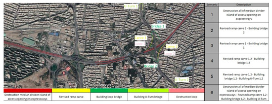 Six feasible and acceptable scenarios are created based on the available and utilizable resources, as shown in Figure 2. The first and sixth scenarios improve network condition for private transportation; all of the scenarios except the first scenario improve road surfacing weaving in Sheikhfazolah-Yadegar interchange and its highways. The first scenario reduces traffic by eliminating the median divider island next to the expressways access from Sheikhfazolah highway. According to safety impact, the w-beam guardrail is considered in scenario 1 and 6 to improve safety because of the removal of the median divider island.