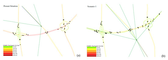 Simulation of the current transportation network and flow per capacity (F/C) ratio for the present situation (a), scenario 1 (b), scenario 2 (c), scenario 3 (d), scenario 4 (e), scenario 5 (f), and scenario 6 (g).