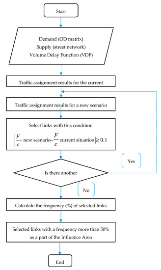 According to Figure 3, it was specified how the proposed scenarios could improve the traffic condition on the network’s links. The links where the total value of the F/C difference between the current situation and each proposed scenario was more than 0.1 were chosen. This process was implemented repetitively for all proposed scenarios, and then, the choice frequency of each link was calculated; for example, if the links are chosen for six times the frequency is 100%. In the present investigation, the links with the choice frequency more than 50% was selected as a part of the IA. Figure 4 explains all the steps of this process in a flow chart. According to Figure 3, the extent of IA includes two street parts and two interchanges with their highways. These streets and interchanges are named Chobtarash, Teimori, Sheikhfazolah–Yadegar, and Sheikhfazolah–Jenah, respectively. Moreover, 4.4 km of the Sheikhfazolah highway, 2.2 km of the Yadegar highway, 2.2 km of the Jenah highway, 0.62 km of Chobtarash, and 0.7 km of Teimori were modeled as the extent of IA.