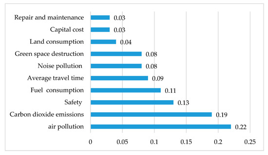 Most of the evaluations of transport sustainability are defined in large-scale. Zheng et al. [19] stated that the goals for transportation sustainability could best be achieved having appropriate metrics to determine what problems exist, where they exist, and consequently, what actions need to be taken. This research proposed an index of transportation sustainability as a tool that could be systematically applied for assessing the sustainability of places. The index comprises elements of the environmental domain, of the social domain and of the economic domain. Jeon et al. [22] compared 15 options for transportation and land use in Atlanta in 2013. They evaluated the sustainable development index by MCDA, in order to identify the most suitable plan for the predetermined sustainability-oriented objectives. As a limitation, the analysis does not explicitly capture the interactions among system performance, the economy, the environment, and social equity. Reisi et al. [26] developed a procedure for getting an index for local areas in Melbourne, by applying normalization, weighting, and aggregation methods. The composite indicator includes environmental, social, and economic sub-indices, and could help for better understanding of the measures and activities that influence the sustainability of urban transport. According to the importance of each indicator, a weight of indicator is specified in this research and many previous researches.