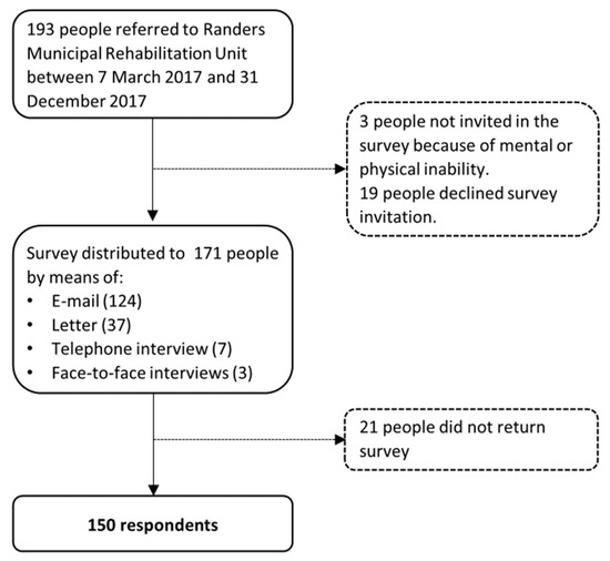 In total, 150 people (77.7%) returned the questionnaire and were included in the analysis (Figure 1). In the few cases where the responses were obtained by telephone interview or with support in the Rehabilitation Unit, the interview was performed within 1–2 weeks after referral. The median response time among e-mail responders was 5 days (n = 110, 14 missing), and IQR was 18 days. Among mail responders, the median response time was 33 days (n = 25, 12 missing) and IQR was 32 days.