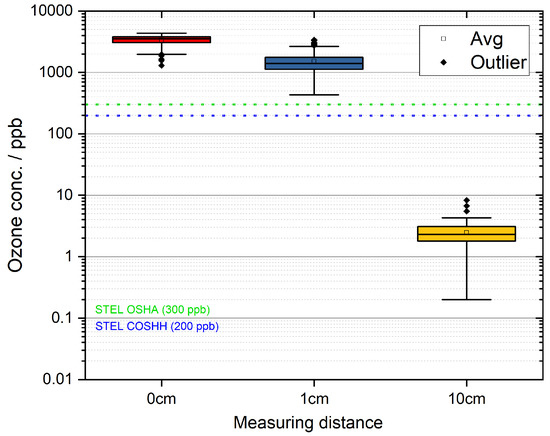 Box plot of ozone concentrations measured at three different distances of the plasma source (logarithmic scaling).