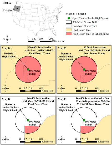 We found in our exposure assessment that there were eight instances of triple exposure of schools to low-access food desert tracts. Maps C–E in Figure 1 use the case of the rural, open-campus, Bonanza Junior/Senior High School of Klamath County to illustrate this triple exposure and how it can vary for one school. Figure 1C shows how this school’s buffer was completely covered by two different 10-mile/16.09-km food desert tracts. Figure 1D,E show how Bonanza’s 500-m buffer only intersected 16.48% of the boundaries for one tract that was classified as a 20-mile/32.19-km food desert and a transit-dependent or 20-mile/32.19-km food desert.
