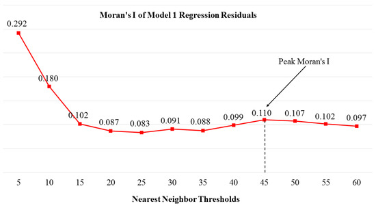 Results from the spatial autocorrelation analysis of the residuals from the logistic regression model without the organizational environment variable (see Model 1, Table 3). The peak Moran’s I value of 0.110 at the 45 nearest neighbor threshold motivated the use of the 45 nearest neighbor threshold for the organizational environment independent variable in the full regression model (Model 2, Table 3).