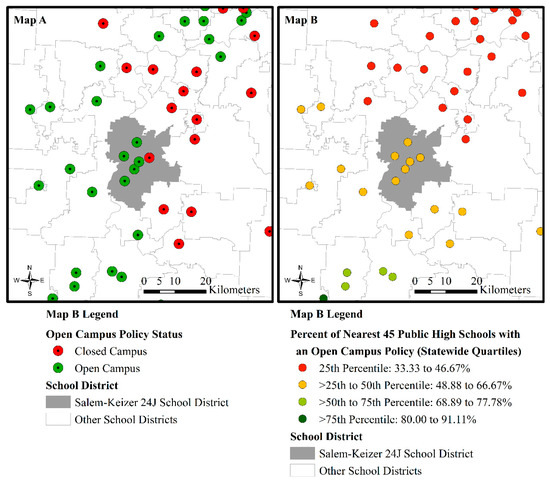 (A) Open campus policy status of Oregon public high schools and (B) the percent of nearest 45 public high schools in relation to the example case of the Salem–Keizer 24J School District and neighboring school districts.