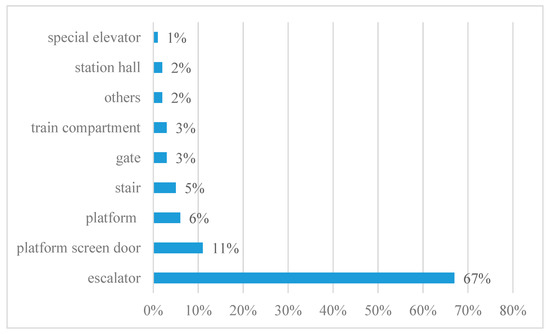 Metro escalator-related injury data were obtained from the Guangzhou Metro Corporation (GMC). Guangzhou Metro is one of the most representative metro systems in China. It consists of 10 lines and 167 stations. It also ranks third in China by annual ridership after Beijing and Shanghai, with 2.4 billion rides delivered in 2015. However, due to the huge passenger flow, passenger injury accidents occurred frequently in metro stations, such as suicide, being caught in the platform screen door, falls on the escalators, and so on. In terms of the location of accidents, escalator-related injuries account for 67% of all passenger injury accidents, as shown in Figure 1.