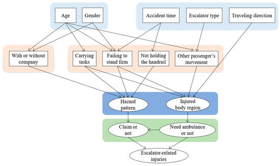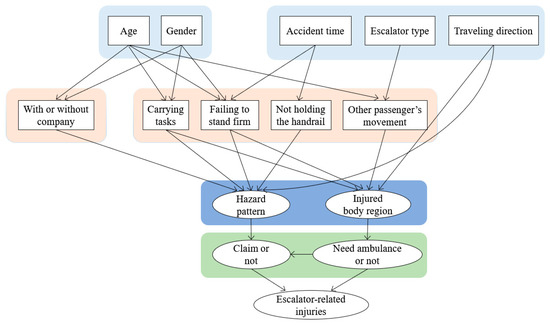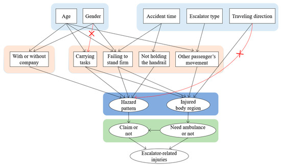 where is a set of nodes, and when is smaller than a certain value, the nodes and are considered to be independent given . Given escalator-related injuries with low probability, the threshold value is 0.015. Through the conditional independence test, the arc between factors “gender” and “carrying out other tasks” and “travel direction” and “hazard pattern” were removed permanently, as shown in Figure 3. As a result, the optimal Bayesian network structure for escalator-related injuries was established and is shown in Figure 4.
