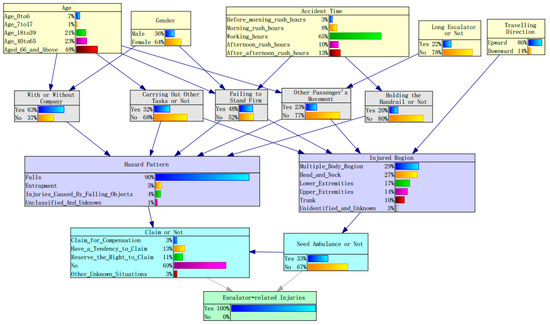 Human factors are generally considered to be contributing factors on the metro escalator safety. The age and gender of passengers are considered as two nodes in the Bayesian network. According to previous studies, passenger age is divided into five groups, i.e., ≤6, 7–17, 18–40, 41–65, and ≥66 [33,34,35]. Traveling alone or with company describes the state of passengers when taking an escalator and has an effect on the number of injuries. Thus, it should be taken into account by the Bayesian network. There are a variety of passenger behaviors that may contribute to escalator-related injuries, among which four types of high distribution percentage are selected as nodes of the Bayesian network to discuss: Failing to stand firm, carrying out other tasks, not holding the handrail, and another passenger’s movement.