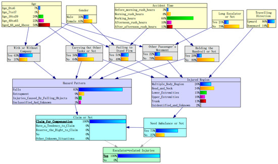 After the optimal structure of a Bayesian network was established, 950 escalator-related injuries cases were used to estimate the parameters of the BN, i.e., the conditional probabilities or posterior probabilities, which capture the relationships and interplay among the factors and find the influence of the different factors on escalator-related injuries. This process is parameter estimation or “learning” [38,39]. If the training data are complete, it is not difficult to learn BN parameters; however, in the real world, training data may be incomplete for a variety of reasons. For example, when modelling consumer behaviors using a BN, the training data may be incomplete because of privacy issues [40]. In this study, the training data were also incomplete as some useful information that may affect escalator-related injuries was not recorded, such as the speed and gradient of the escalator and the dress and footwear of the victim. For an incomplete dataset, different algorithms have been explored to find maximum-likelihood estimates of parameters (i.e., the posterior probability) for a BN, including expectation–maximization [40,41,42,43,44,45], Markov chain Monte Carlo methods such as Gibbs sampling [46], and gradient descent methods [47]. Among these algorithms, the most popular method is using an EM algorithm [48]. An expectation–maximization (EM) algorithm is an iterative algorithm that converges to a maximum likelihood estimate [45]. It can be divided into two steps: One is E step, which calculates expectation, the other one is M step, which calculates maximum [48]. Previous studies proved that the EM algorithm could be applied in parameter learning of a BN [40,41,42,43,44,45,49]. Therefore, in this study, the EM algorithm was used to estimate posterior probabilities of the BN in the software of Genie 2.0, which is a tool for artificial intelligence modeling and machine learning with Bayesian networks [25]. In this software, the probability of escalator-related injuries was set to 100% because all injuries have already happened. Whether or not an ambulance was called describes the injury severity of escalator-related incidents to a certain extent, as well as whether or not a claim was made. Therefore, these two severity factors were selected to be representatives and set to 100% to explore the impact of various risk factors on the severity of escalator-related injury.