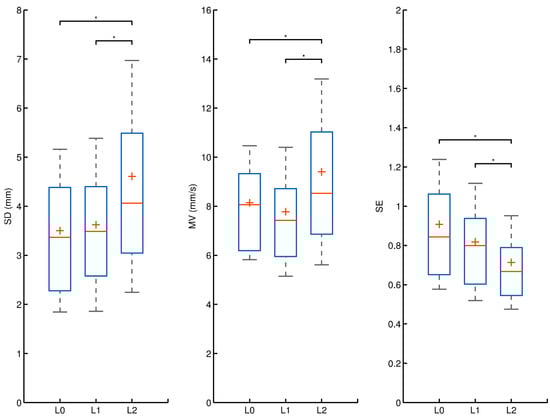 Results of the post hoc Tukey (HSD) test revealed differences in postural-stability control between experiment conditions in both the A–P and M–L directions. Figure 1 shows differences between experiments with respect to SD, MV, and SE. Results revealed that the weight of the external load significantly affected postural control and the characteristics of the subjects’ sway. Postural control among participants decreased significantly in Experiment L2. The post hoc test showed that the highest load in Experiment L2 produced a significant increase in the variability of sway (SD) compared to the conditions in Experiments L0 and L1 (p ≤ 0.001 and p ≤ 0.002, respectively). Additionally, sway MV was significantly higher in Experiment L2 than that in L1 (p ≤ 0.001) and L0 (p ≤ 0.01). In contrast, entropy was significantly lower in Experiment L2 than that in Experiments L0 and L1 (p ≤ 0.001 and p ≤ 0.05, respectively).