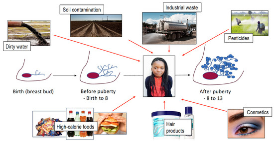 Young women face exposures to carcinogens and potential carcinogens by drinking water, breathing air, applying cosmetics, and eating food (Figure 3). Increasing evidence suggests that early life stress may also impact a woman’s future health. While some compounds such as heavy metals have known toxic effects, much is not known. One key gap in our understanding of how environmental exposures before and during puberty may impact breast cancer risk is that potential environmental carcinogens are typically studied as single agents and not in mixtures. Here, we review some of the major environmental carcinogens and exposures young women may have before and after puberty. Economically disadvantaged neighborhoods disproportionately bear the impact of environmental exposures. This unequal burden of exposures in young women is thought to increase lifelong risk for cardiovascular disease, obesity, and cancers, including breast cancer.