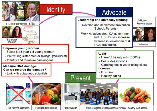 Young women living in disadvantaged neighborhoods experience additional challenges including a lack of access to healthy food (food deserts) and contaminated water and soil (neighborhood red-lining). Through our K-12 community based science technology, engineering, and math (STEM) programs, we aim to engage elementary/middle-school girls in community science. Students will measure environmental toxins in their tap water, read food labels, and identify food additives; we will work with students to develop strategies to reduce exposures (Figure 4). With our scientific team students, we will (1) test water and soil, (2) teach about diet, and (3) work with the government to develop an action plan. The ultimate goal of our efforts is to foster a generation of young women who are aware of environmental exposures in their environment, have the STEM training to measure and evaluate environmental carcinogens, and are empowered to act as advocates for their own health (Figure 4).