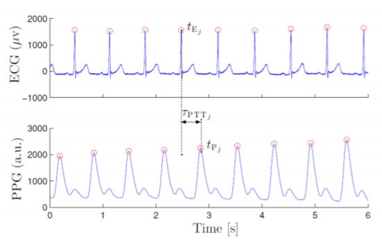 Once the features found in the literature and the results reported for them were extracted, the development of an algorithm in Python was carried out following the intermediate phases of the Cross-Industry Standard Process for Data Mining—CRISP-DM methodology (data preparation, modeling, and evaluation). This algorithm has three functions: to extract the features employing digital processing of cardiac rhythm signals, to select the most determining features employing machine learning, and to evaluate the performance presented by different groups of these features in the detection of AF. The algorithm is based on the analysis of the interbeat intervals, which can be observed and analyzed in both ECG and PPG signals. Due to the lack of public datasets of heart rhythm signals taken through photoplethysmography sensors from patients diagnosed with atrial fibrillation, the algorithm developed for the digital processing of heart rhythm signals and subsequent detection of AF was implemented based on ECG signals found in five open Physionet datasets (1656 signals: 828 normal sinus rhythm signals and 828 signals with presence of atrial fibrillation) [5,6,7,8,9]. This was possible because the PPG and ECG signals are closely related. These signals only differ in a constant delay between the peak of the ECG signal and the peak of the PPG signal, commonly known as pulse transition time (PPT), as shown in Figure 1. This is caused due to the time elapsed from the occurrence of ventricular systole until the PPG sensor detects the event. It should be noted that beyond this remarkably constant time delay, there is no major discrepancy between the intervals between peaks. This was demonstrated in [10], indicating that the correlation index between the two intervals is very close to 1. This leads to the conclusion that the extraction of the interbeat intervals for the detection of atrial fibrillation can be performed regardless of whether it is an ECG or PPG signal. Due to the retrospective nature of this records-based research study, which is using only publicly available and de-identified physiological databases found in Physionet, the study is exempt from approval from an ethics committee, according to the Common Rule (45 CFR 46) of the U.S. Department of Health & Human Services.