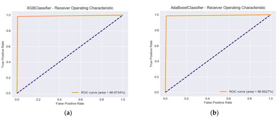 (a) XGBClassifier ROC Curve and AUC; (b) AdaBoostClassifier ROC Curve and AUC.