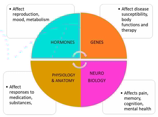 Sex related factors include a number of aspects of human biology, physiology, anatomy and genetics (see Figure 1). Bodily characteristics at birth are either male or female, with a small percentage of individuals who are labelled as intersex due to ambiguous characteristics []. These male or female characteristics contribute to a lifetime of developmental milestones, processes and stages, and determine reproductive capacity. In addition, a range of processes are affected by sex-based factors such as rates of metabolism, production of sex hormones, organ function, and development and distribution of adipose tissue, among others. These factors affect the ingestion of substances, including cannabis, and their rate of absorption, effects and impacts on the body and brain. These sex-based factors can also affect the response to therapeutic and treatment regimes, such as pharmaceutical treatments.