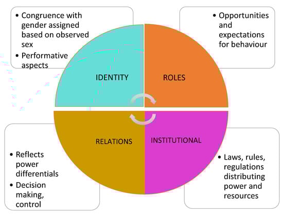Gender is often assumed or ascribed, based on our sex. Gender related factors are those connected to the gender relations we experience, the gender roles and norms to which we are exposed and influenced by, our gender identities (such as feminine, masculine, or gender diverse) and the gendered regulations and rules embedded in institutions such as education, politics and religion (see Figure 2). These factors are often temporal and culturally dependent and can change over time.