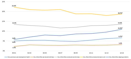 The aim of the present study was to investigate trends in self-reported general health, overall stress, work-related stress, feelings of loneliness, and sleeping problems in 335,625 Swedish adults across gender affiliation, regions, lengths of education, and age groups during 2000–2016. Based on previous studies, the hypotheses are that all health factors show a negative trend of poorer general health, more overall and work-related stress, more feelings of loneliness, and sleeping problems. Individuals with lower education, women, and young individuals are hypothesized to experience greater reductions in subjective health ratings than other education groups, men, and older individuals. The present study thus adds to the literature by taking a broad picture in a large sample describing various health factors together including demographics, allowing further understanding how these co-occur over time.