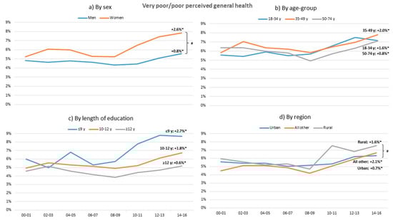 During the study period, poor general health increased significantly in both women and men, all age groups, different length of education, and regions, with all trends mostly during the last eight years (Figure 2). Poor general health increased more in women than in men (p < 0.05). During 2014–2016, women experienced significantly higher level of poor general health than men.
