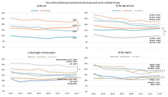 Change in standardized proportions of often or very often perceived overall stress (solid lines) and at work (dashed lines) between 2000–2001 and 2014–2016 in relation to sex, age group, length of education, and region. * Significant trend between 2000–2001 and 2014–2016 within sub-group, p > 0.05. # Significant trend difference between sub-groups, adjusted for multiple comparisons. All analyses are adjusted for the other sub-group variables.
