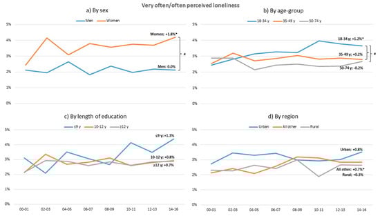 Change in standardized proportions of often or very often perceived loneliness between 2000–2001 and 2014–2016 in relation to sex, age-group, length of education and region. * Significant trend between 2000–2001 and 2014–2016 within sub-group (p < 0.05). # Significant trend difference between sub-groups, adjusted for multiple comparisons. All analyses are adjusted for the other sub-group variables.
