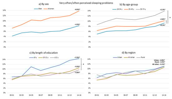Change in standardized proportions of often or very often sleeping problems between 2000–2001 and 2014–2016 in relation to sex, age group, length of education, and region. * Significant trend between 2000–2001 and 2014–2016 within sub-group (p > 0.05). # Significant trend difference between sub-groups, adjusted for multiple comparisons. All analyses are adjusted for the other sub-group variables.
