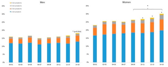 The risk of having more than three symptoms has increased significantly from 2000 to 2016, in particular in individuals with low education and young individuals between 18 and 34 years. The proportion of women with more than three risk symptoms has increased significantly since 2010. Moreover, men were more likely to have no symptoms and less likely to have three symptoms, compared to women, both in the first year and in the last year of the study period. This is in line with the literature showing women and those belonging to a low socioeconomic group are at the highest risk for ill-health [6,7,26,27,28].
