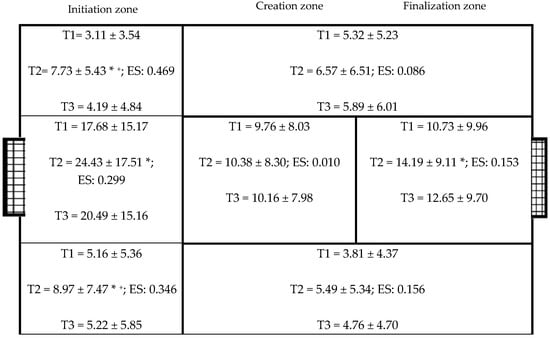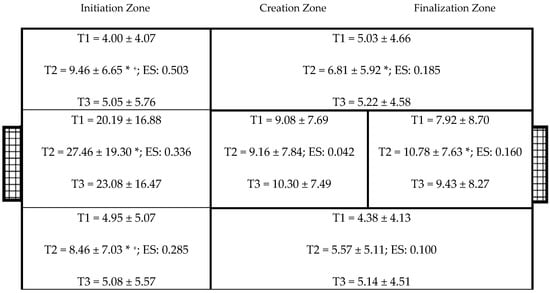 Figure 1 shows the zones in which the player obtained possession of the ball. Statistically significant differences were found in the left initiation zones (F2,35 = 17.691, p < 0.001, η2 = 0.503). Tournament 2 had a higher occurrence for this than Tournament 1 (p < 0.001) and Tournament 3 (p < 0.001). The effect size of this variable was moderate. In the central zone (F2,35 = 8.875, p = 0.001, η2 = 0.336), Tournament 2 had a higher occurrence than Tournament 1 (p = 0.001). The effect size of this variable was moderate. In the right initiation zone (F2,35 = 6.967, p = 0.003, η2 = 0.285), Tournament 2 had a higher occurrence than Tournament 1 (p = 0.002) or Tournament 3 (p = 0.011). The effect size of this variable was moderate. Statistically significant differences were found in the left creation–finalization zone (F2,35 = 3.968, p = 0.028, η2 = 0.185). Tournament 1 had a higher occurrence for this than Tournament 2 (p = 0.025). The effect size of this variable was minimal. Statistically significant differences were found in the central finishing zone (F2,35 = 3.337, p = 0.047, η2 = 0.160). Tournament 1 had a higher occurrence for this than Tournament 2 (p = 0.045). These differences had a moderate effect size.