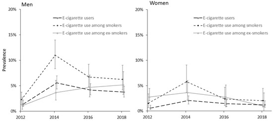 The same period saw a statistically significant increase in e-cigarette use (Figure 1). Among men, the overall prevalence of e-cigarette use increased from 1.4% (95% CI 0.9–2.2) in 2012 to 3.7% (95% CI 2.8–4.9) in 2018. Among women, the e-cigarette use increased from 0.6% (95% CI 0.3–1.1) in 2012 to 1.2% (95% CI 0.7–2.0) in 2018, but the change was statistically not significant.