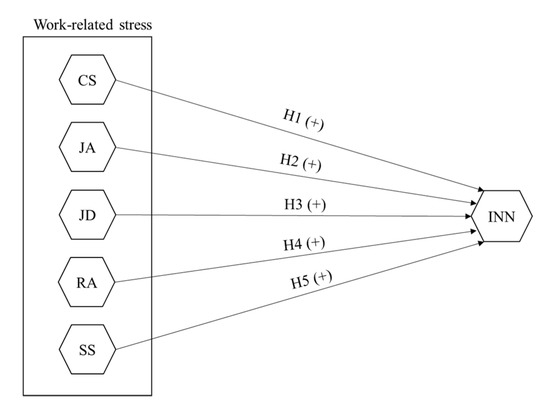 This paper is in line with the study developed by [7], who presented detailed information about the development, reliability, and validity of the Stress Questionnaire (SQ), which is based on five main psychosocial risks that might lead to stress-related negative outcomes. In this study, we focused on the five subscales of work-related stress: (a) job demands; (b) job control; (c) role ambiguity; (d) supervisors’ support; and (e) colleagues’ support proposed by these authors. These five factors or subscales of work-related stress, commonly labeled as “job stressors”, have been studied independently by other authors. However, this study addresses them jointly to assess how they influence employees’ levels of innovativeness.