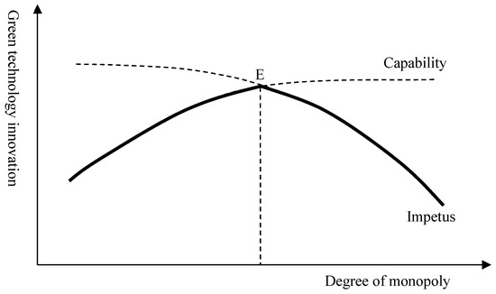 The previous analysis shows that the innovation incentive under competitive conditions is stronger than that under monopolistic conditions [58,59,60,61,62]. However, the increase in labor costs can lead to a decrease in corporate profits and corporate technological innovation capabilities. Hence, the market structure’s regulatory effect on firms’ implementation of green technological innovation will no longer be linear. Figure 3 illustrates the role of the market structure in adjusting the effects of the rise of labor costs on green technological innovation. The horizontal axis is the degree of monopoly that reflects market structure, and the degree of monopoly increases as it moves to the right. The horizontal axis is the effect of the rise of labor cost on green technological innovation. The green technological innovation capability curve moves upward, whereas the impetus curve declines. These two curves exhibit an intersection point, which is Point E. On the left of Point E, the impetus for green technological innovation is stronger than capability, while capability determines or restricts whether firms will implement green technological innovation. Thus, the degree of monopoly should be increased to promote green technological innovation. On the right of Point E, the impetus of green technological innovation is weaker than capability, which may determine whether firms will innovate. Thus, increasing the degree of monopoly can decrease the impetus for green technological innovation. Accordingly, two hypotheses presented here illustrate how labor cost effects to green technological innovation.