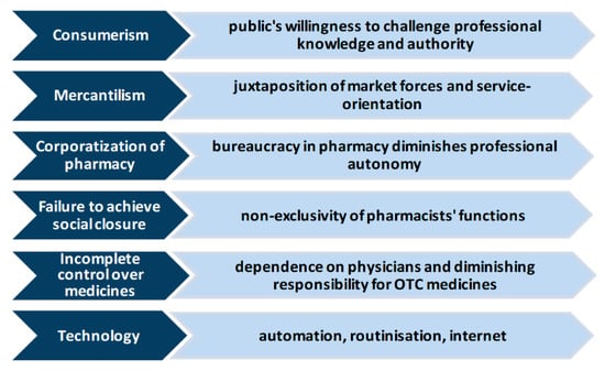 In the light of what is considered in this section, it is possible to identify and highlight the factors that are undermining the professional status of the pharmacist, and they are condensed in Figure 1 [3].