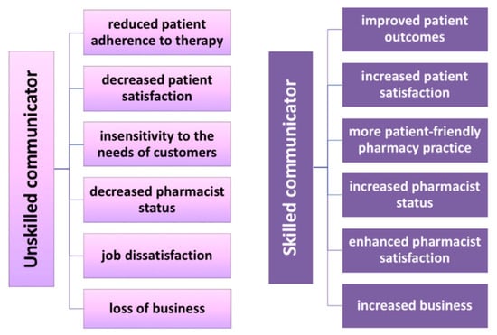 Ineffective communication can cause consequences affecting the patient, but also the pharmacist, such as greater concern among patients leading to a regression of the pharmacist’s professional status, to job dissatisfaction, to a loss of customers and, therefore, to a loss of business [59]. On the contrary, if the pharmacist was a skilled communicator, communication with the patient would be more effective and the final result would be positive for both, in particular in terms of patients’ satisfaction since they would have a more positive view of pharmacy, considering it as a practice open to their specific needs. The pharmacist would acquire greater personal satisfaction and self-esteem, would see an increase in the clientele, and would obtain a commercial advantage to strengthen his/her business (Figure 2) [59].