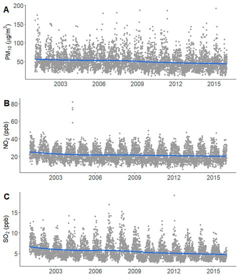 Distribution (grey dot) and smoothing trend (blue line) of mean PM10 (A), NO2 (B), and SO2 (C) concentration from 2001 to 2015 in Korea.