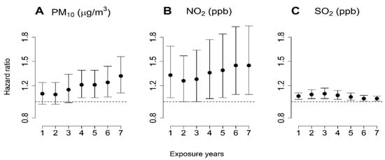 Hazard ratio and 95% confidence interval (CI) for end-stage renal disease (ESRD) mortality by duration of exposure to PM10 (A), NO2 (B), and SO2 (C) in a time-varying Cox model adjusted for sex, age, smoking status, hemoglobin, body mass index (BMI), Charlson comorbidity index (CCI), duration of therapy, working status, marital status, education, insurance, population density, and the number of medical institutions.