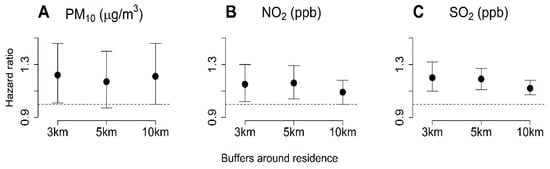 We analyzed the data of the ESRD cohort from the Seoul National University Hospital between 2008 and 2017. A total of 5910 patients with ESRD were enrolled, and 58.7% were male. During the follow-up period of a mean of 3.57 years, the mortality rate of the validation cohort was 29.6%. Exposure was determined by calculating the average concentration of air pollutants measured by the monitoring stations within the buffer regions of 3 km (n = 4627), 5 km (n = 5287), and 10 km (n = 5535). The HRs of PM10, NO2, and SO2 measured at monitoring stations within 3 km of the residences of participants were 1.22 (1.01–1.46), 1.15 (1.02–1.30), and 1.20 (1.10–1.32), respectively, when the IQR unit was 8.13 μg/m3 for PM10, 4.73 ppb for NO2, and 0.93 ppb for SO2 (Figure 3).
