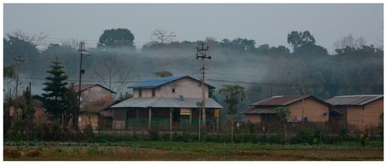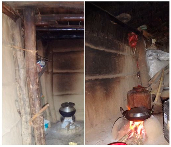 In South Asia, higher levels of indoor air pollution are associated with biomass-based cooking and heating activities accompanied with poor ventilation. Simultaneously, formation of a thick smoke layer in the ambient air is commonly observed in villages at the time of cooking (Figure 1), indicating that a significant amount of smoke escapes from the indoor to the outdoor environment. Previous studies have also explained about the deposition of certain fraction of pollutants on the kitchen walls before exiting the kitchens to ambient environment [27,29]. Pictorial evidence of such deposition (wall and roof coated with black particles) can be found in Figure 2, indicating that in most of these rural households, certain fractions of particulates are trapped on the kitchen walls or roof instead of escaping outdoors. However, little information exists on what fraction of cooking emissions escapes into the ambient environment and its possible adverse health outcomes. Moreover, various tools/software such as AirQ, BenMap, AirQ+, etc. have been developed to understand the health impacts of air pollution [30,31]. Different air pollutants (PM2.5, PM10, NO2, and O3) can be used as input to these tools to derive acute and chronic health outcomes of air pollution exposure. However, these tools were developed based on outcomes of epidemiological studies in Western Europe and North America; hence using them in other regions of the world might involve uncertainties.